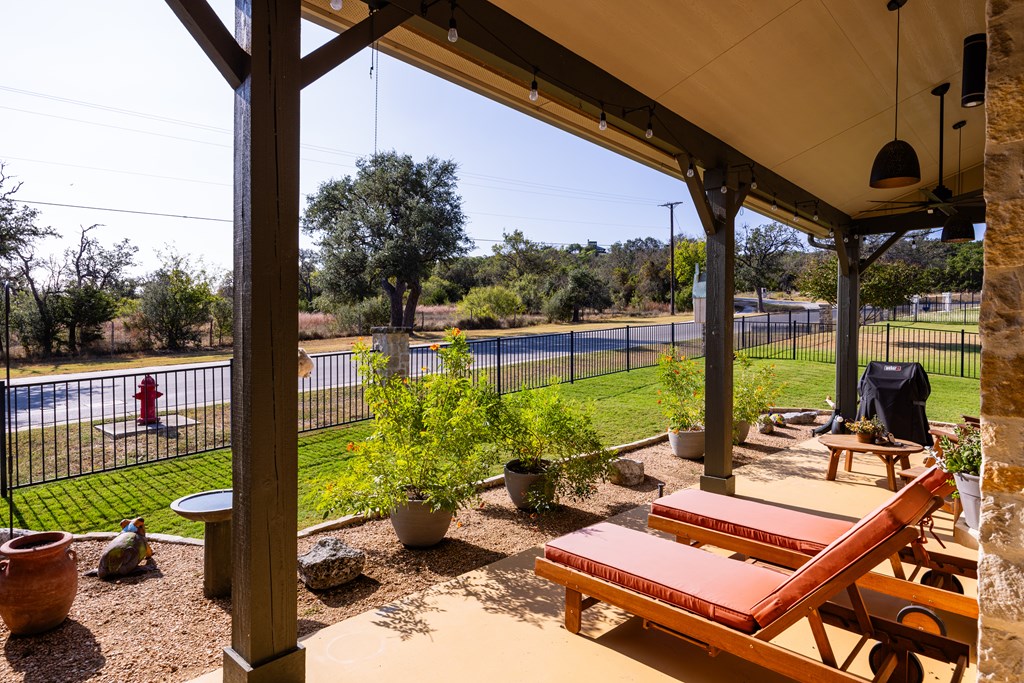 Lovely stand alone German Cottage in Comanche Trace with no shared wall on a large 0.28 acre lot. Open floor plan with vaulted ceiling with beams and fireplace in great room as well as outdoor fireplace on covered patio. Primary suite has spacioius bathroom with walk-in shower and large walk-in closet. Tile floors throughout and tiled front porch. 2 1/2 Car Garage with separate door for golf cart. Garage has direct access into the house. This home is located in a yard-maintained neighborhood.
